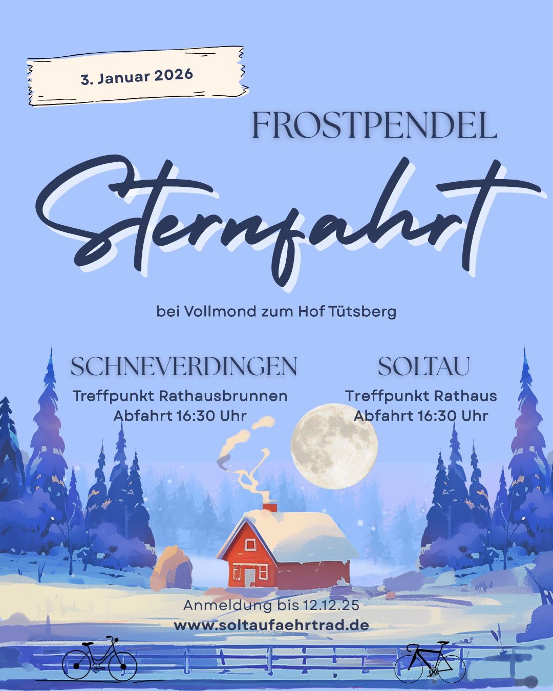 Die Frostpendler-Gruppen „Schneverdinger Eisschnucken“ und „Soltau fährt Rad“ laden am 3. Januar 2026 zu einer magischen Sternfahrt zum Hof Tütsberg bei Vollmond ein.